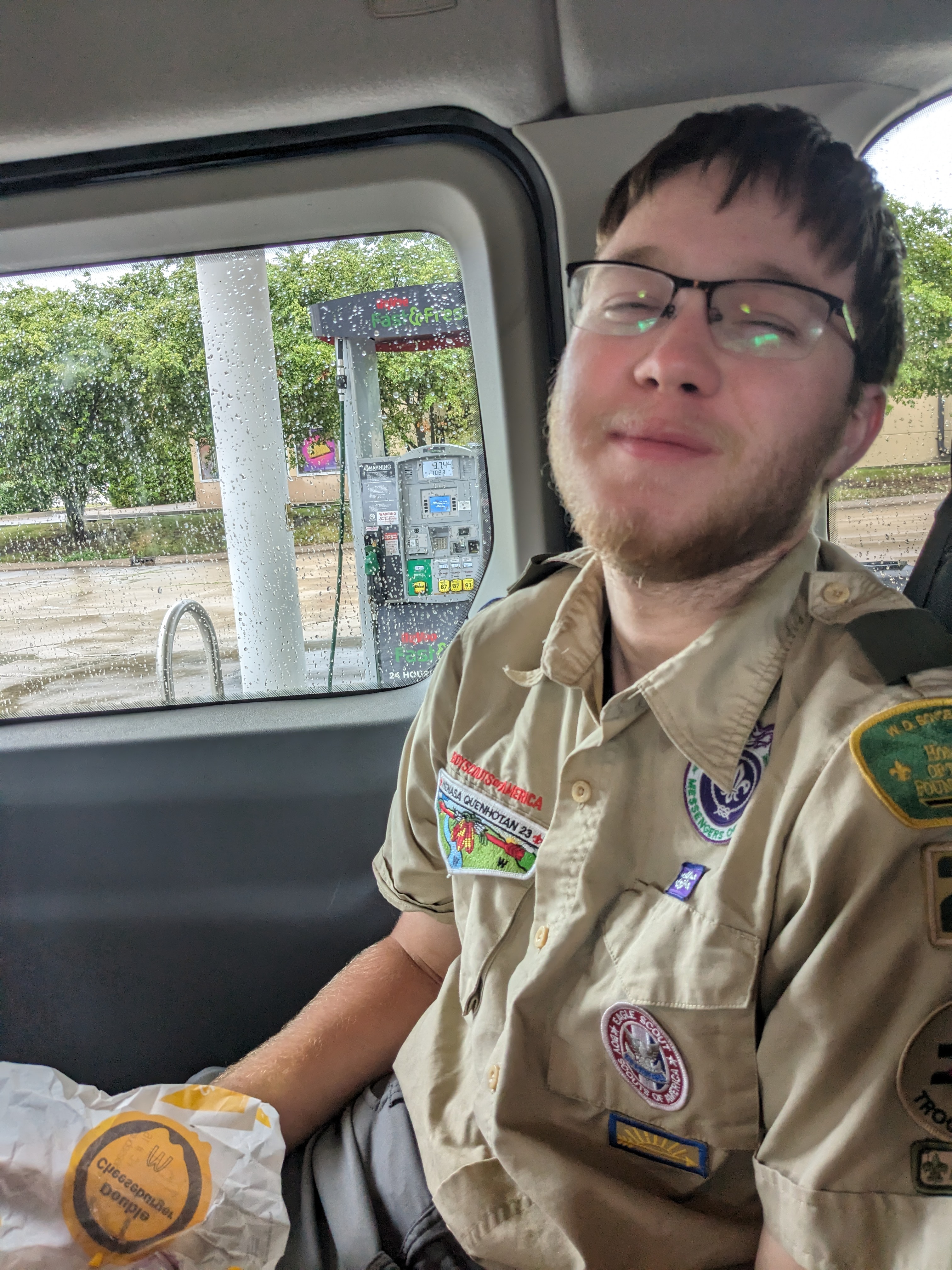 Here is Patrick after his Philmont trip. After two weeks of dehydrated food, he said McDonald's tasted good. I don't have pictures of his trip but I'm sure he'll be happy to share with you if you ask.
